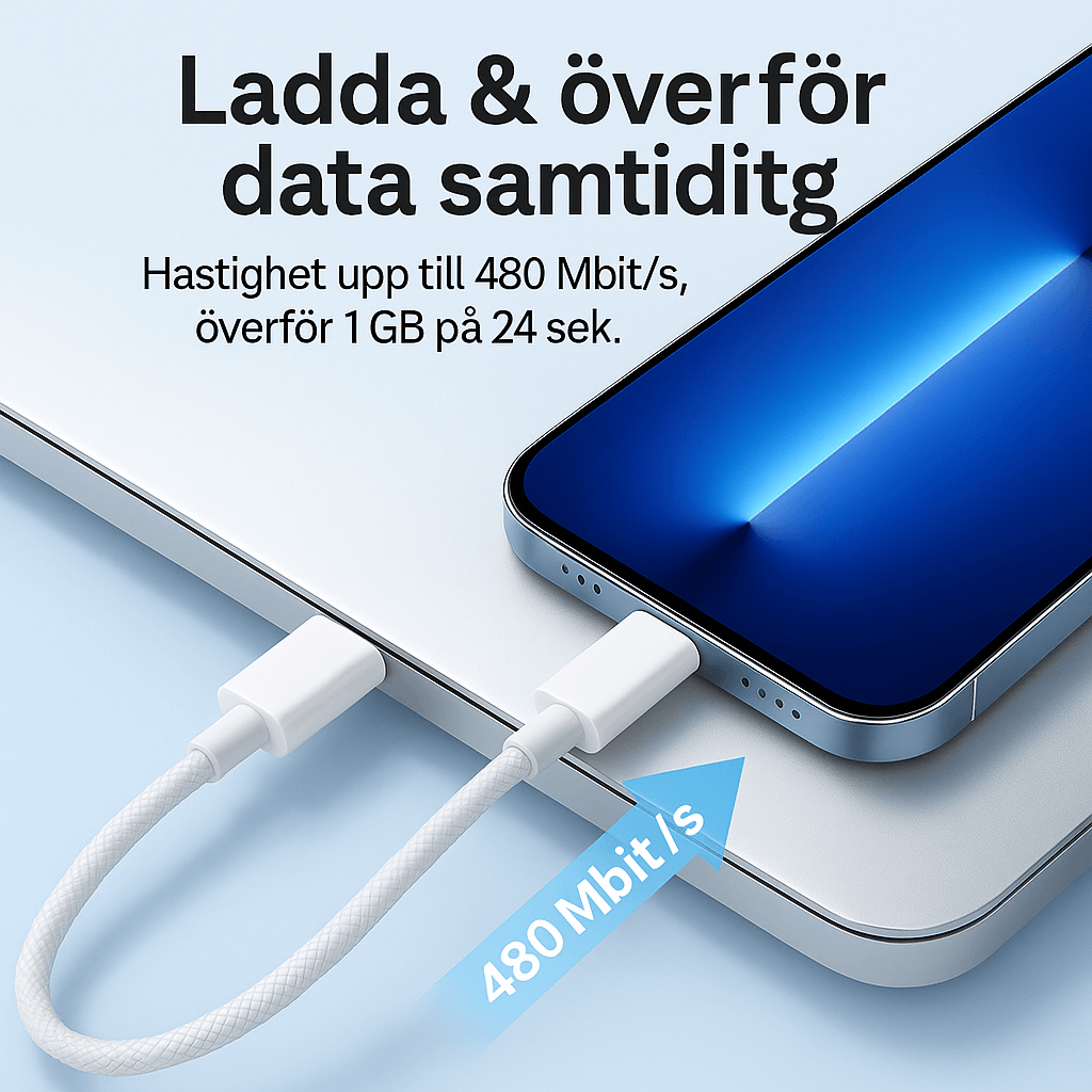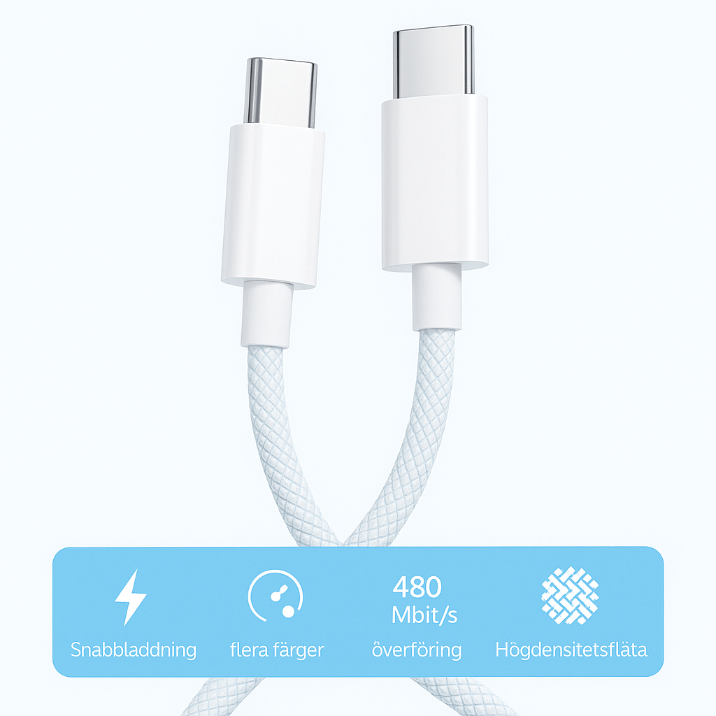Med våran 60W USB-C till USB-C-kabel laddar du dina enheter upp till tre gånger snabbare än med en vanlig kabel. Den stöder upp till 6A ström och passar perfekt för både mobiler, surfplattor, laptops och powerbanks. Den flätade designen gör kabeln extra slitstark, medan den smarta chipstyrningen skyddar mot överhettning, överspänning och kortslutning.