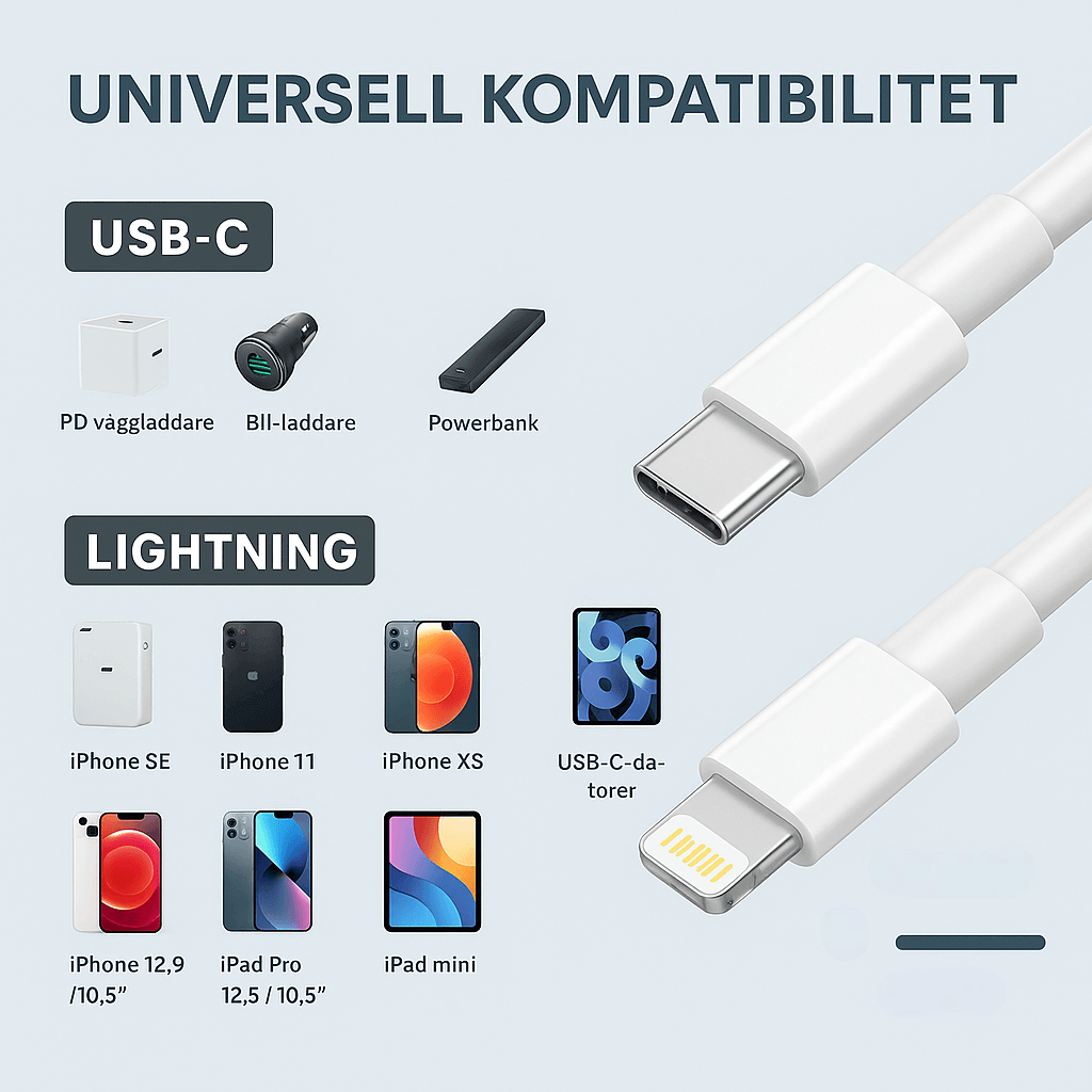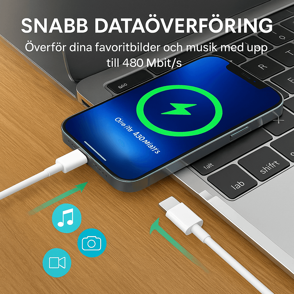 Denna USB-C till Lightning-kabel är perfekt för dig som vill snabbladda din iPhone eller iPad med upp till 20W PD-effekt. Kabeln är MFI-certifierad, vilket garanterar säker laddning och stabil dataöverföring. Med stöd för överföringshastigheter upp till 480 Mbps kan du enkelt flytta bilder, musik och filer mellan enheter.